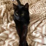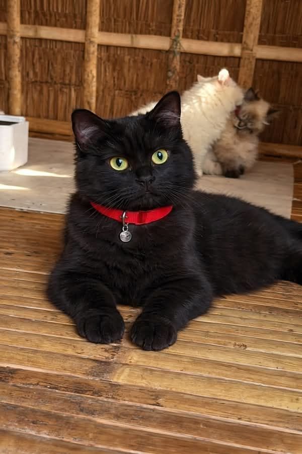 That deep, velvety black fur—smooth and rich like the night sky—paired with a bright red collar that wraps gently around its neck. The red doesn’t overpower; it highlights. It frames the cat’s presence like a signature, a small but powerful detail that says: this is not just any cat.