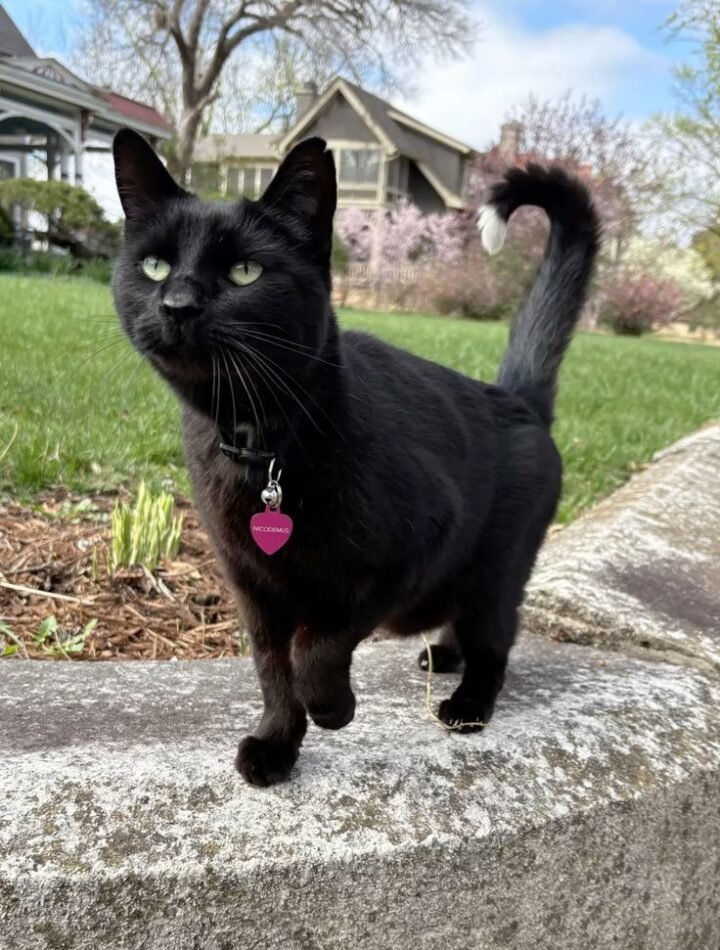 Around its neck hangs a small tag, a subtle hint that this mysterious being belongs somewhere… yet feels completely independent. It walks freely, balancing between two worlds—the comfort of home and the endless call of the outside. That delicate balance is what makes it so fascinating. It is both loved and untamed.
